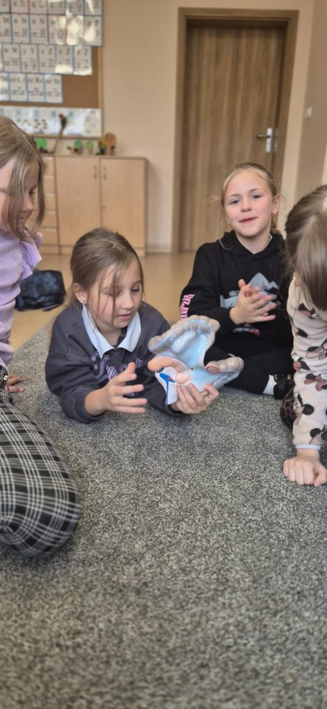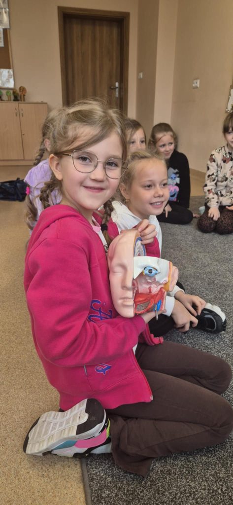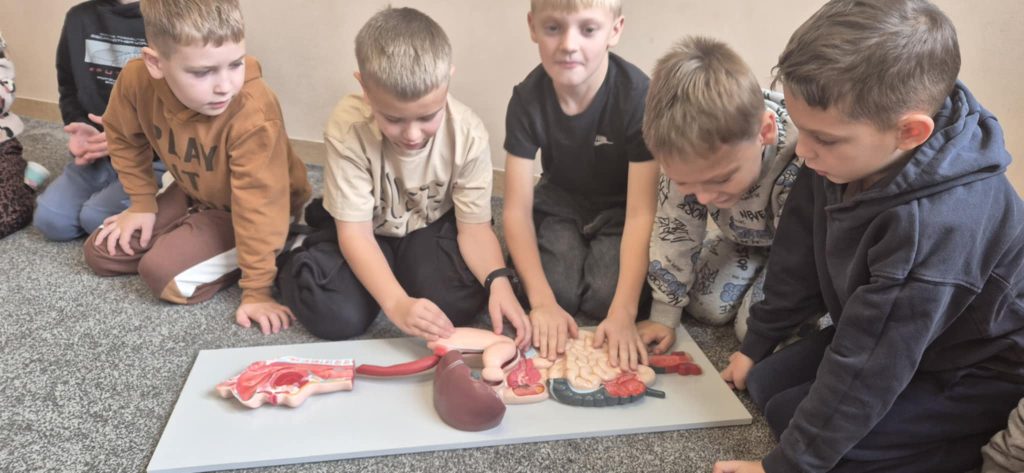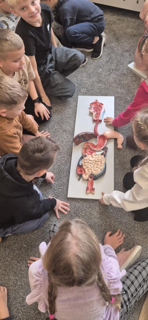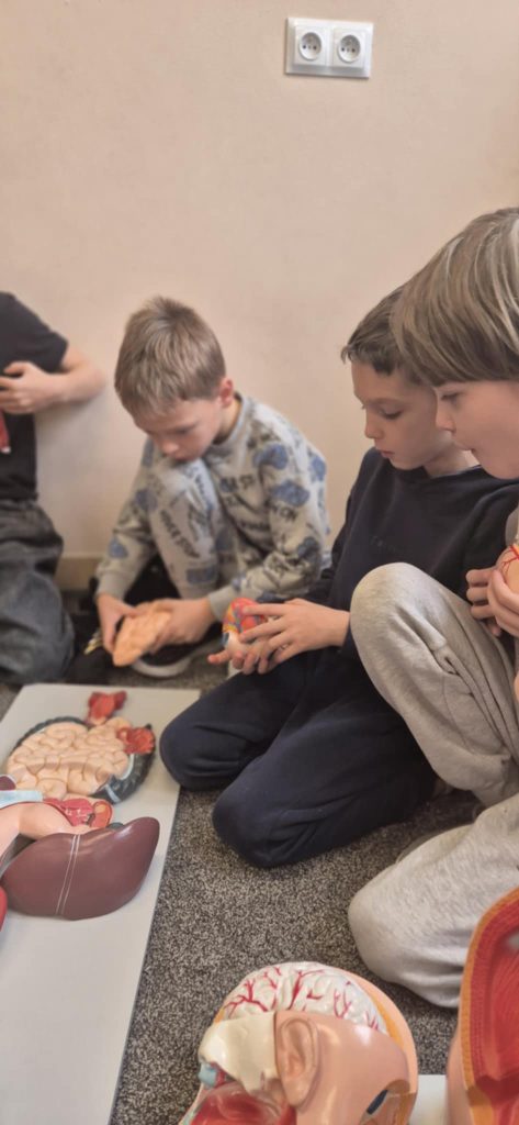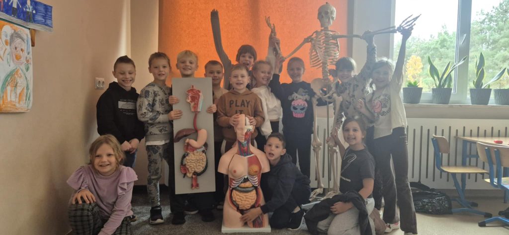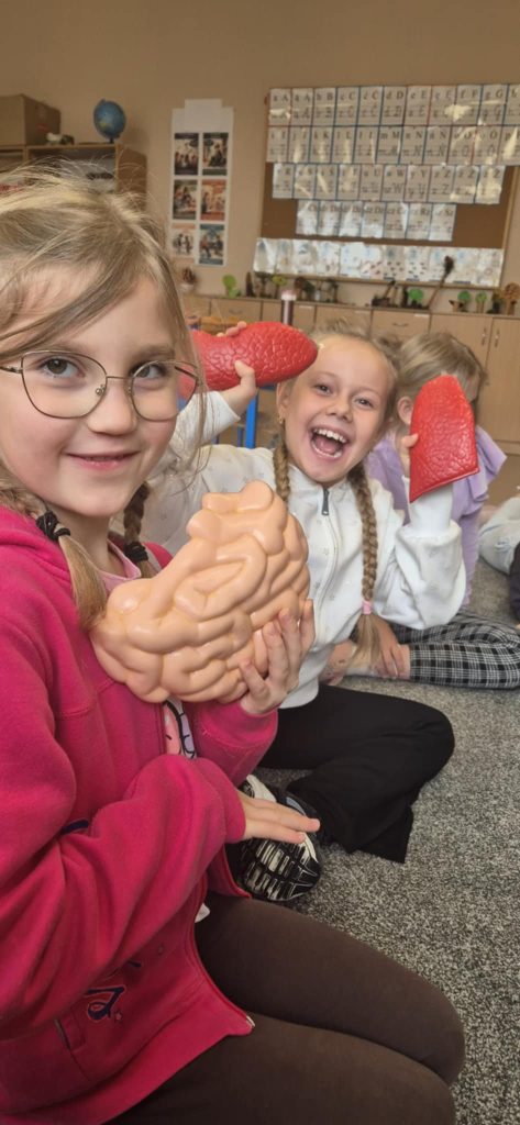 Podczas ostatnich zajęć z edukacji przyrodniczej uczniowie klasy 2b mieli okazję poznać budowę ludzkiego ciała oraz najważniejsze narządy wewnętrzne. Z pomocą specjalnych modeli edukacyjnych mogli zobaczyć, jak wyglądają m.in. płuca, serce i żołądek, jelita, mózg, itp. Dzięki tak ciekawym pomocom naukowym lekcja stała się prawdziwą przygodą – uczniowie byli zafascynowani, zadawali wiele pytań i z dużym zainteresowaniem odkrywali tajemnice ludzkiego organizmu.